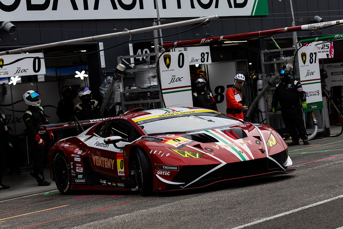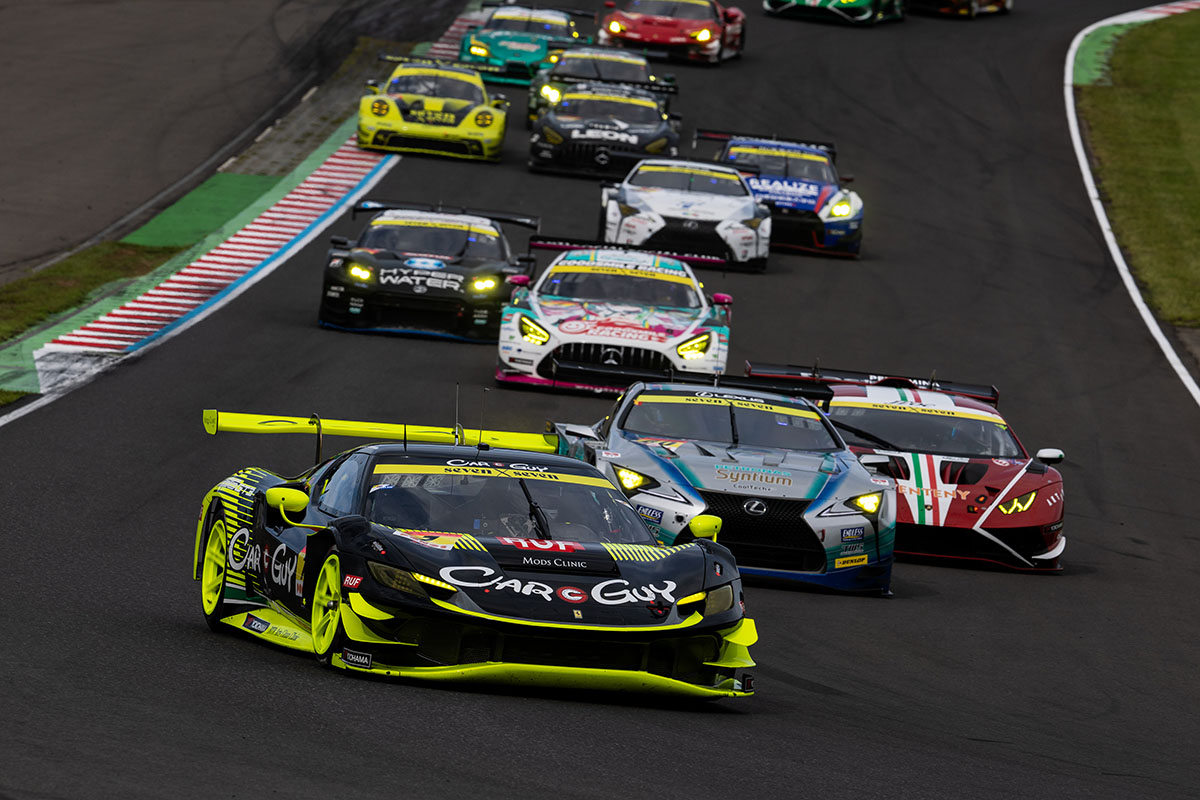 明くる21日(日)は晴天に恵まれ、決勝はドライコンディションでスタート。ポールポジションの7号車 CARGUY Ferrari 296 GT3 を先頭に隊列が一斉にスタートを切った。序盤から60号車 Syntium LMcorsa LC500 GT と0号車 VENTENY Lamborghini GT3 が2番手争いを展開。ここは60号車がポジションを守り、さらにペースの上がらない7号車を捉えて7周目に首位を奪った。