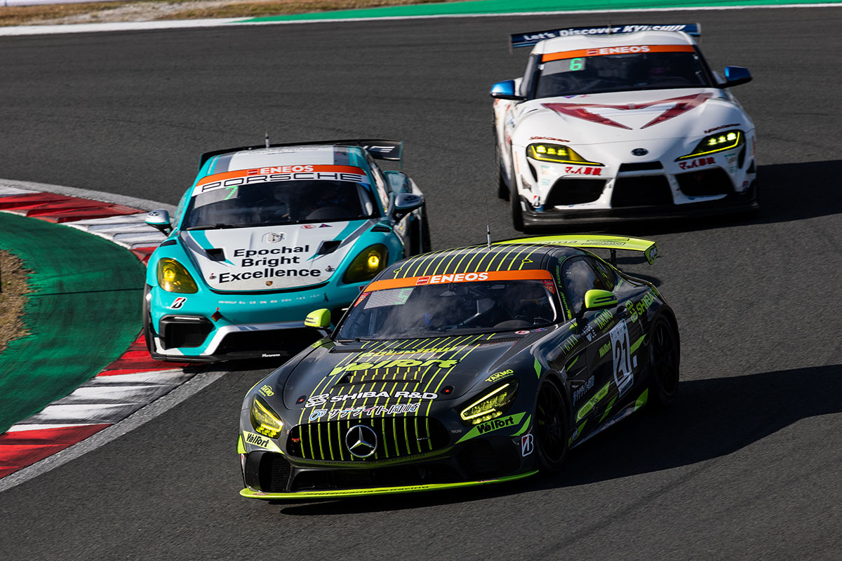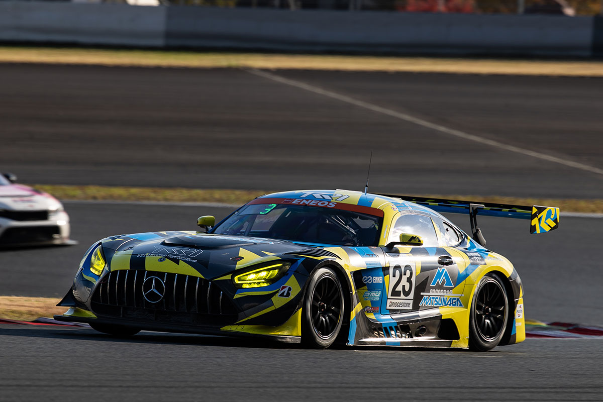 今回、白熱したタイトル争いが展開されたのはST-Xだ。33号車Craft-Bamboo Racing Mercedes-AMG GT3がクラスポールポジションを獲得し、決勝でも序盤はその勢いのままリードを築いていったが、途中でガレージインを余儀なくされトラブルに泣く結果となった。背後には、クラス7番手から追い上げたランキングトップで初タイトル獲得を狙う23号車TKRI松永建設AMG GT3が迫り、上位争いは拮抗した。