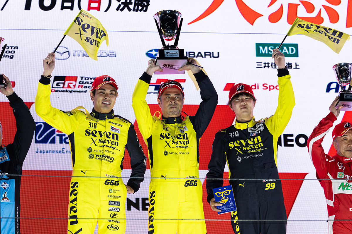 長いレースの中でライバル勢に次々とトラブルが発生し、遅い戦線離脱となっていく展開のなか、代わって81号車DAISHIN GT-Rがレースを牽引する展開となった。しかしFCYで流れが変わり、導入直前にピットインを済ませた666号車seven x seven PORSCHE GT3Rdが大逆転。終盤まで順位をキープし、ノートラブル・ノーアクシデントで優勝を手にした。今季4勝目を挙げ、参戦初年度から圧倒的な存在感を示して逆転でのチャンピオンに輝いた。